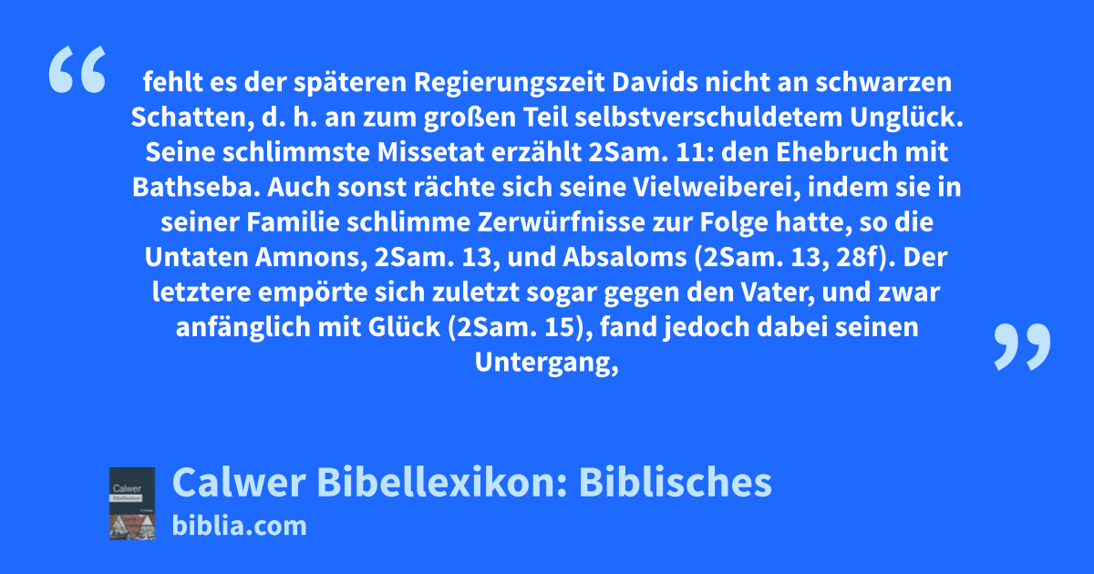 Seine schlimmste Missetat erzählt 2Sam. 11: den Ehebruch mit Bathseba. Auch sonst rächte sich seine Vielweiberei, indem sie in seiner Familie schlimme Zerwürfnisse zur Folge hatte, so die Untaten Amnons, 2Sam. 13, und Absaloms (2Sam. 13, 28f). Der letztere empörte sich zuletzt sogar gegen den Vater, und zwar anfänglich mit Glück (2Sam. 15), fand jedoch dabei seinen Untergang, indem die zuverlässigsten Männer zu David hielten (2Sam. 16) und der König, der über den Jordan geflohen war, als Sieger wiederkehrte. Noch kurz vor Davids Tod suchte einer seiner Söhne, Adonia, auf eigene Faust sich des Thrones zu bemächtigen, den David vielmehr dem Salomo, dem Sohn der Bathseba, zugedacht hatte. Es gelang jedoch noch vor Davids Ableben, die Herrschaft dem Salomo zu sichern (1Kön. 1). Die 1Kön. 2 diesem von seinem Vater gegebenen Ratschläge wollen aus den damaligen Rechtsanschauungen verstanden sein. Das Todesurteil über Joab und Simei war ein wohlverdientes und durch die Staatsweisheit gebotenes; wenn David aus persönlichen Gründen auf ihre Bestrafung verzichtet hatte, so war dies für seinen Nachfolger nicht bindend. David riet also nicht nach persönlicher Rachgier, sondern nach Maßgabe des Rechts, welches zu vollstrecken für die Wohlfahrt des Reiches erforderlich schien. Die „letzten Worte Davids“, 2Sam. 23, sind ein prophetischer Blick auf die seinem Haus aus seinem gottesfürchtigen Regiment erwachsende herrlichere Zukunft. Er starb, etwa 70 Jahre alt, und wurde in der „Stadt Davids“ auf dem Zion begraben, 1Kön. 2, 10.