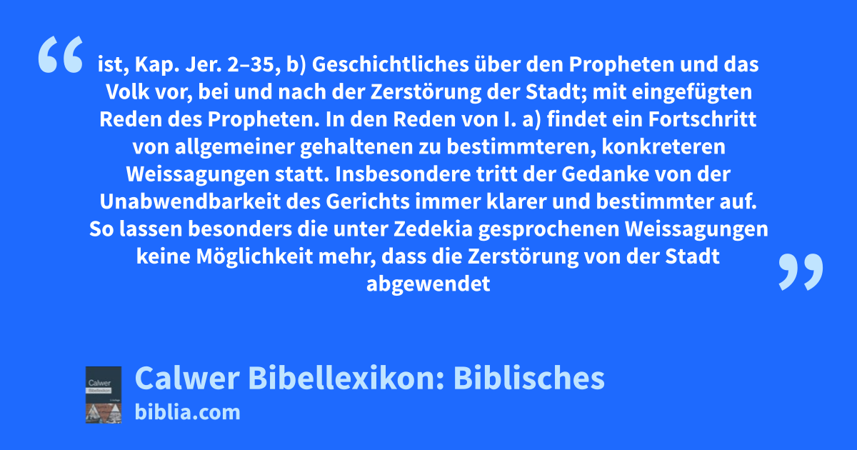 In den Reden von I. a) findet ein Fortschritt von allgemeiner gehaltenen zu bestimmteren, konkreteren Weissagungen statt. Insbesondere tritt der Gedanke von der Unabwendbarkeit des Gerichts immer klarer und bestimmter auf. So lassen besonders die unter Zedekia gesprochenen Weissagungen keine Möglichkeit mehr, dass die Zerstörung von der Stadt abgewendet werden könnte, vergleiche Jer. 21, 1–7; Jer. 24, 8–10; Jer. 27, 12–22; Jer. 29, 16–19; Jer. 32, 1–5. Jer. 32, 26–30. Die einzige Verheißung, die Jeremia für Zedekia hat, ist die einer Milderung seines Loses, wenn er sich den Chaldäern ergebe. Aber der Bestimmtheit der Gerichtsdrohung entspricht auch die der Heilsweissagungen, unter denen durch die Bestimmtheit der Vorhersagung und die Genauigkeit der Erfüllung die merkwürdigste, die von der 70-jährigen Dauer der Gefangenschaft ist, Jer. 25, 11f; Jer. 29, 10. Die inhaltlich bedeutendsten Heilsweissagungen finden sich in der Gruppe Kap. Jer. 30–33; Jer. 31, 31–34; Jer. 32, 37ff, von dem neuen Bund und Jer. 32, 15f, vergleiche Jer. 23, 5f.