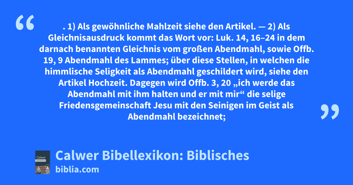 — 2) Als Gleichnisausdruck kommt das Wort vor: Luk. 14, 16–24 in dem darnach benannten Gleichnis vom großen Abendmahl, sowie Offb. 19, 9 Abendmahl des Lammes; über diese Stellen, in welchen die himmlische Seligkeit als Abendmahl geschildert wird, siehe den Artikel Hochzeit. Dagegen wird Offb. 3, 20 „ich werde das Abendmahl mit ihm halten und er mit mir“ die selige Friedensgemeinschaft Jesu mit den Seinigen im Geist als Abendmahl bezeichnet; dieselbe erscheint dadurch gleichsam als Fortsetzung des traulichen Verkehrs Jesu mit seinen Jüngern auf Erden (vergleiche Luk. 24, 29f).