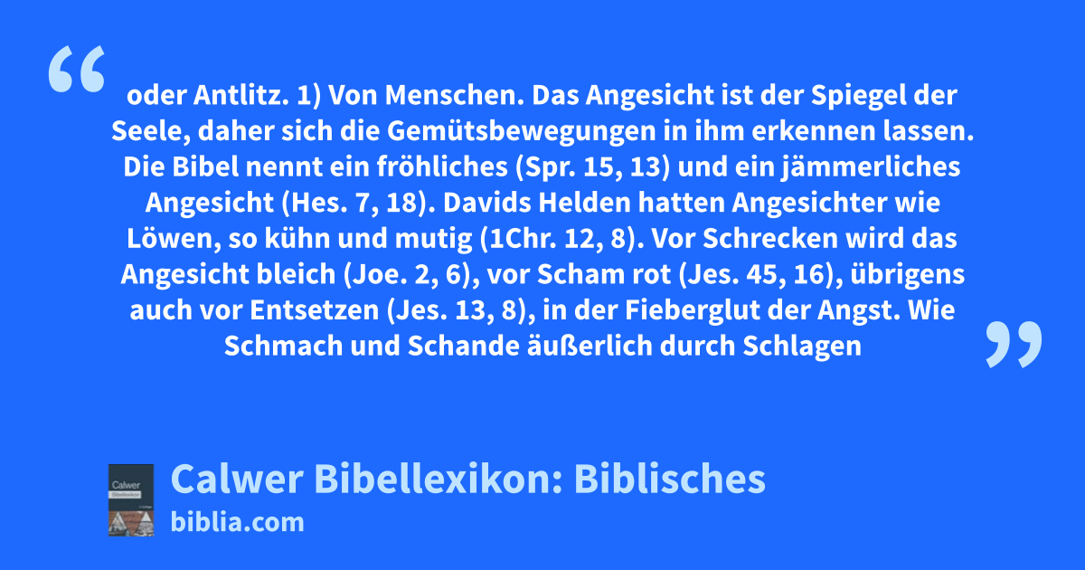1) Von Menschen. Das Angesicht ist der Spiegel der Seele, daher sich die Gemütsbewegungen in ihm erkennen lassen. Die Bibel nennt ein fröhliches (Spr. 15, 13) und ein jämmerliches Angesicht (Hes. 7, 18). Davids Helden hatten Angesichter wie Löwen, so kühn und mutig (1Chr. 12, 8). Vor Schrecken wird das Angesicht bleich (Joe. 2, 6), vor Scham rot (Jes. 45, 16), übrigens auch vor Entsetzen (Jes. 13, 8), in der Fieberglut der Angst. Wie Schmach und Schande äußerlich durch Schlagen und Anspeien das Angesicht trifft (Matth. 26, 67), so lastet überhaupt alle Schande hauptsächlich auf dem Angesicht (Psa. 44, 16). Auch die Weisheit des Menschen erleuchtet sein Angesicht (Spr. 8, 1), aber der Trotz macht es härter als Fels (Jer. 5, 3). Das Triumphgefühl des Überwinders strahlte in Stephanus’ Angesicht, dass es aussah wie eines Engels Angesicht (Apg. 6, 15). Auf Moses Angesicht ließ der Anblick Gottes einen Abglanz zurück (2Mos. 34, 29). Auf dem Verklärungsberge leuchtete Jesu Angesicht wie die Sonne (Matth. 17, 2), und auf dem Angesicht des erhöhten Herrn leuchtete die volle Klarheit Gottes (2Kor. 4, 6).