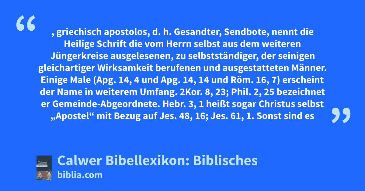 Apostel, griechisch apostolos, d. h. Gesandter, Sendbote, nennt die Heilige Schrift die vom Herrn selbst aus dem weiteren Jüngerkreise ausgelesenen, zu selbstständiger, der seinigen gleichartiger Wirksamkeit berufenen und ausgestatteten Männer.