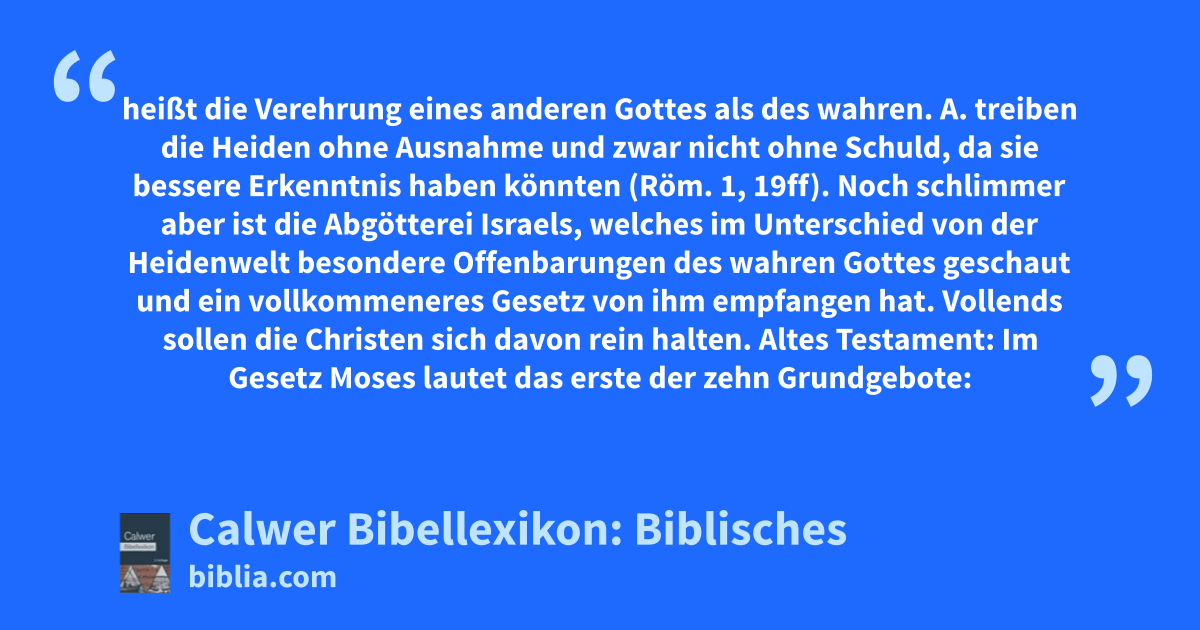 — Im Neuen Testament wird ebenso ernstlich vor Abgötterei gewarnt, die den durch Christus zur Wahrheit Geführten und Geheiligten noch weniger ansteht als dem Volk des Alten Bundes, nämlich erstens vor eigentlichem Götzendienst, d. h. Beteiligung an heidnischem Kultus, der Idolen, in Wahrheit Dämonen galt, zum Beispiel Teilnahme an Mahlzeiten zu Ehren dieser Mächte (1Kor. 10, 14ff; Gal. 5, 20); zweitens vor Anbetung der widergöttlichen Weltmacht, des „Tieres“ (Offb. 13, 15 usf.), welches die Art des kleinen Hornes, Dan. 7, 8, an sich hat und selber im Dienst des Drachen, d. h. des Satans steht, Offb. 13, 4. Zu vergleichen ist auch die Anbetung des Satans selbst als Fürsten dieser Welt, welche der Herr Matth. 4, 9; Luk. 4, 7f als Abgötterei von sich weist. Drittens vor Abgötterei im übertragenen sittlichen Sinn des Wortes, wohin der Mammonsdienst gehört, der den wahren Gottesdienst ausschließt nach Matth. 6, 24; der Dienst des Bauches, Röm. 16, 18; Phil. 3, 19 u. dgl. vergleiche auch die Artt. Astarte, Baal, Bilderdienst, Dagon, Höhen, Kalb usw.
