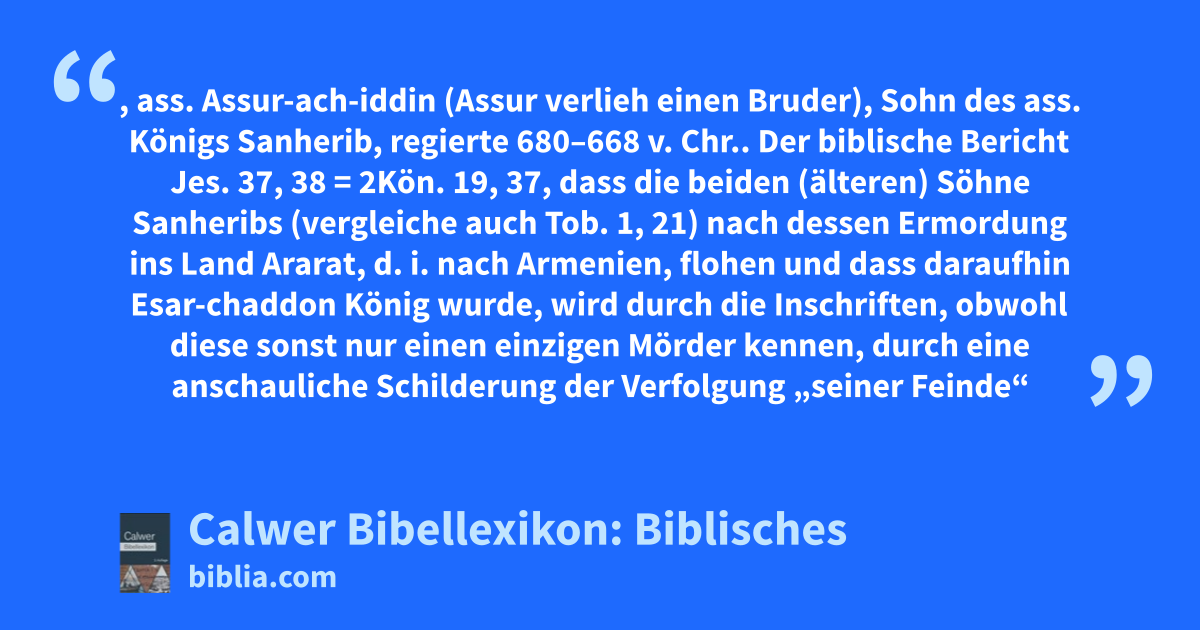 Asarhaddon, ass. Assur-ach-iddin (Assur verlieh einen Bruder), Sohn des ass. Königs Sanherib, regierte 680–668 v. Chr.. Der biblische Bericht Jes. 37, 38 = 2Kön. 19, 37, dass die beiden (älteren) Söhne Sanheribs (vergleiche auch Tob. 1, 21) nach dessen Ermordung ins Land Ararat, d. i. nach Armenien, flohen und dass daraufhin Esar-chaddon König wurde, wird durch die Inschriften, obwohl diese sonst nur einen einzigen Mörder kennen, durch eine anschauliche Schilderung der Verfolgung „seiner Feinde“ bis nach dem Lande Chanigalbat (d. i. Melitene an der kleinasiatisch-armenischen Grenze) und ihre Niederlage daselbst ergänzt; einmütig erscholl danach im Heere der Ruf „dieser (d. i. Asarhaddon) ist unser König“.