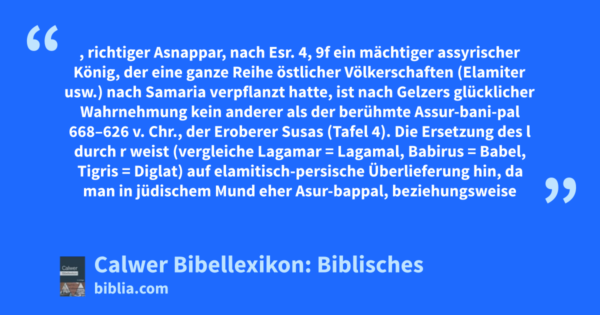 Asnaphar, richtiger Asnappar, nach Esr. 4, 9f ein mächtiger assyrischer König, der eine ganze Reihe östlicher Völkerschaften (Elamiter usw.) nach Samaria verpflanzt hatte, ist nach Gelzers glücklicher Wahrnehmung kein anderer als der berühmte Assur-bani-pal 668–626 v. Chr., der Eroberer Susas (Tafel 4).