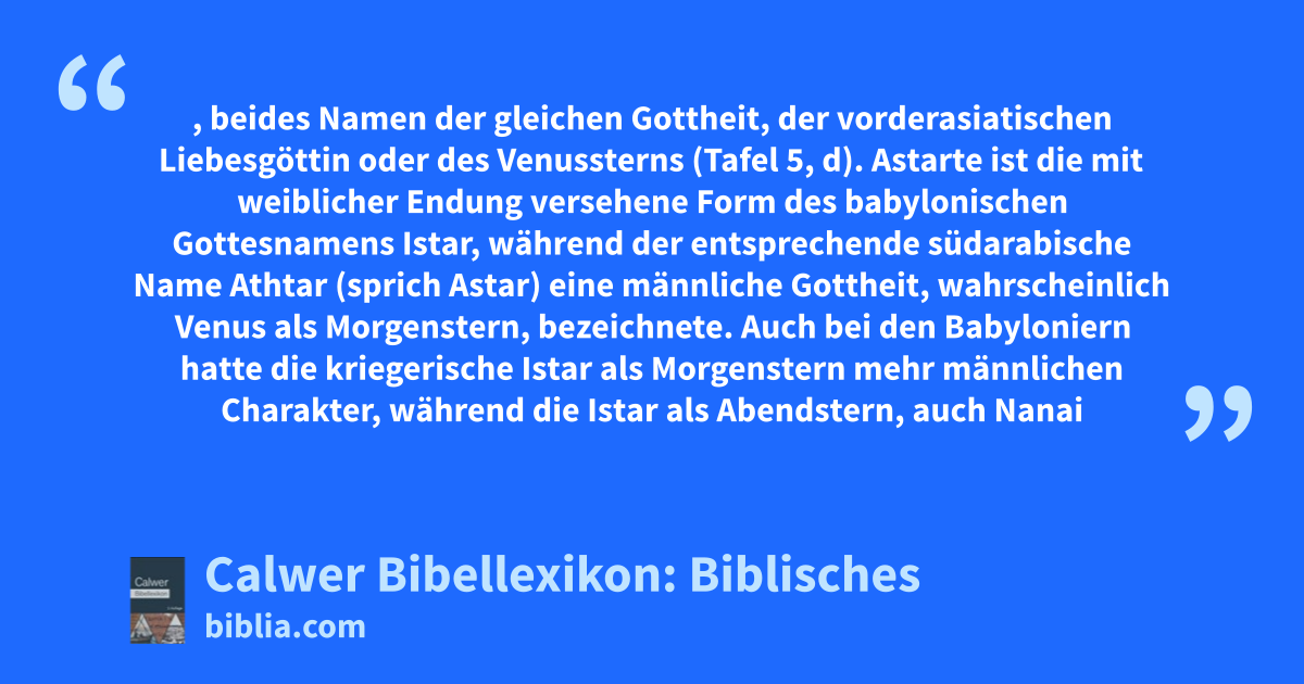 Astarte und Aschera, beides Namen der gleichen Gottheit, der vorderasiatischen Liebesgöttin oder des Venussterns (Tafel 5, d). Astarte ist die mit weiblicher Endung versehene Form des babylonischen Gottesnamens Istar, während der entsprechende südarabische Name Athtar (sprich Astar) eine männliche Gottheit, wahrscheinlich Venus als Morgenstern, bezeichnete. Auch bei den Babyloniern hatte die kriegerische Istar als Morgenstern mehr männlichen Charakter, während die Istar als Abendstern, auch Nanai (Nanäa 2Makk. 1, 13) genannt, die Liebesgöttin war. Gelegentlich scheint dann Astarte auch als Mondgöttin aufgefasst worden zu sein, vergleiche den Ortsnamen Astaroth-Karnaim, das ist die Astarte-Gottheiten (Majestätsplural) mit den Hörnern.