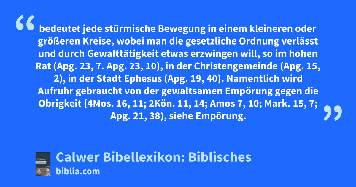 Aufruhr bedeutet jede stürmische Bewegung in einem kleineren oder größeren Kreise, wobei man die gesetzliche Ordnung verlässt und durch Gewalttätigkeit etwas erzwingen will, so im hohen Rat (Apg. 23, 7. Apg. 23, 10), in der Christengemeinde (Apg. 15, 2), in der Stadt Ephesus (Apg. 19, 40).