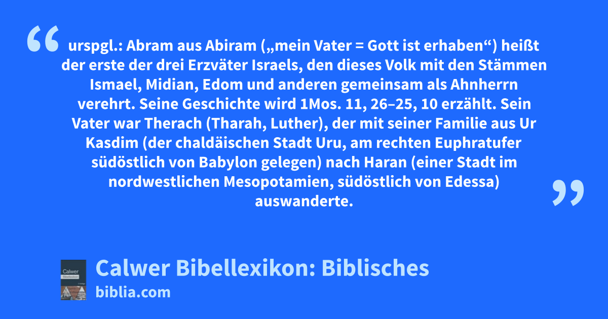 Abraham urspgl.: Abram aus Abiram („mein Vater = Gott ist erhaben“) heißt der erste der drei Erzväter Israels, den dieses Volk mit den Stämmen Ismael, Midian, Edom und anderen gemeinsam als Ahnherrn verehrt. Seine Geschichte wird 1Mos. 11, 26–25, 10 erzählt. Sein Vater war Therach (Tharah, Luther), der mit seiner Familie aus Ur Kasdim (der chaldäischen Stadt Uru, am rechten Euphratufer südöstlich von Babylon gelegen) nach Haran (einer Stadt im nordwestlichen Mesopotamien, südöstlich von Edessa) auswanderte. Von dort zog Abraham mit seinem Brudersohn Lot weiter nach Kanaan, und zwar auf göttlichen Befehl, wie schon der Auszug aus Ur in Chaldäa nach 1Mos. 15, 7 (vergleiche Neh. 9, 7) auf höheren Antrieb erfolgt war. Der Herr sonderte sich so aus dem mehr und mehr gleich der übrigen Menschheit in Heidentum versunkenen Stamm Sems einen Zweig aus, dem er sich in seiner Einzigkeit und Heiligkeit offenbarte und mit dem er einen „Bund“ (siehe den Art.) schloss, 1Mos. 17, 1ff.
