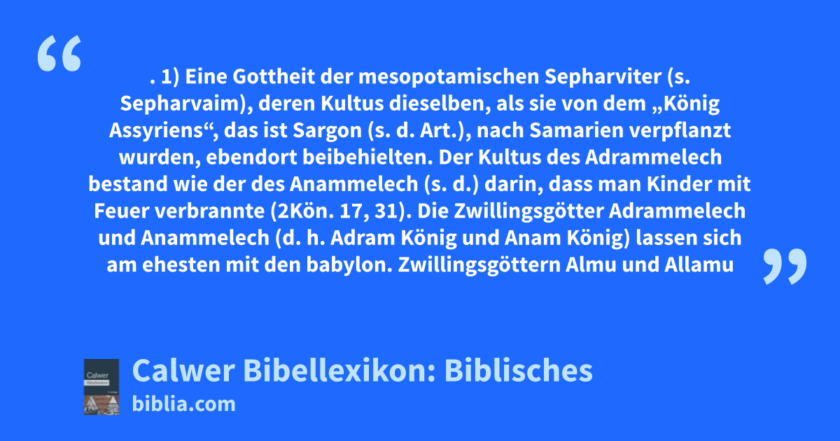 1) Eine Gottheit der mesopotamischen Sepharviter (s. Sepharvaim), deren Kultus dieselben, als sie von dem „König Assyriens“, das ist Sargon (s. d. Art.), nach Samarien verpflanzt wurden, ebendort beibehielten. Der Kultus des Adrammelech bestand wie der des Anammelech (s. d.) darin, dass man Kinder mit Feuer verbrannte (2Kön. 17, 31).