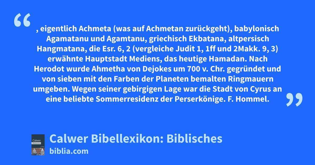 Ahmetha, eigentlich Achmeta (was auf Achmetan zurückgeht), babylonisch Agamatanu und Agamtanu, griechisch Ekbatana, altpersisch Hangmatana, die Esr. 6, 2 (vergleiche Judit 1, 1ff und 2Makk. 9, 3) erwähnte Hauptstadt Mediens, das heutige Hamadan.
