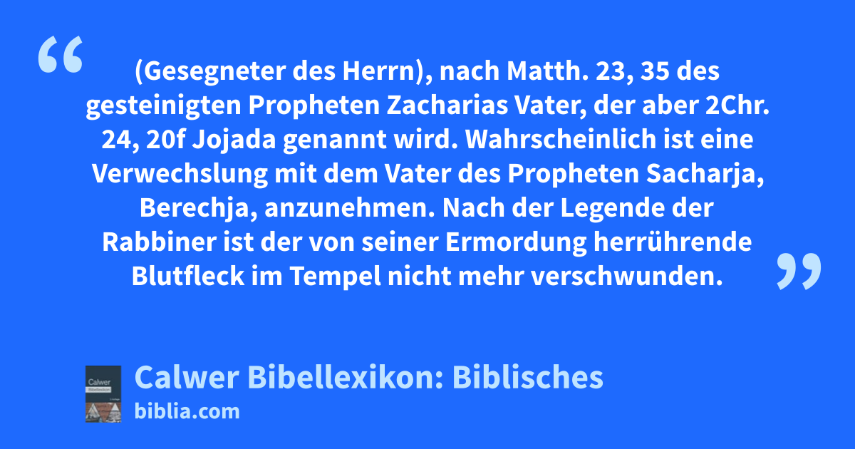 Wahrscheinlich ist eine Verwechslung mit dem Vater des Propheten Sacharja, Berechja, anzunehmen. Nach der Legende der Rabbiner ist der von seiner Ermordung herrührende Blutfleck im Tempel nicht mehr verschwunden.