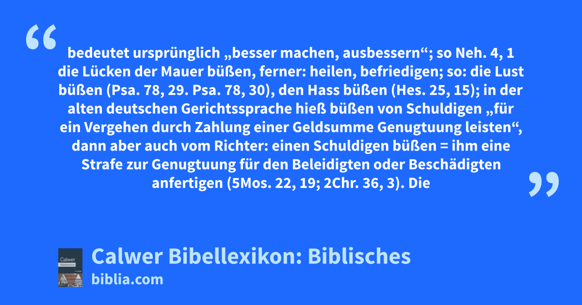 Büßen bedeutet ursprünglich „besser machen, ausbessern“; so Neh. 4, 1 die Lücken der Mauer büßen, ferner: heilen, befriedigen; so: die Lust büßen (Psa. 78, 29. Psa. 78, 30), den Hass büßen (Hes. 25, 15); in der alten deutschen Gerichtssprache hieß büßen von Schuldigen „für ein Vergehen durch Zahlung einer Geldsumme Genugtuung leisten“, dann aber auch vom Richter: einen Schuldigen büßen = ihm eine Strafe zur Genugtuung für den Beleidigten oder Beschädigten anfertigen (5Mos. 22, 19; 2Chr. 36, 3).