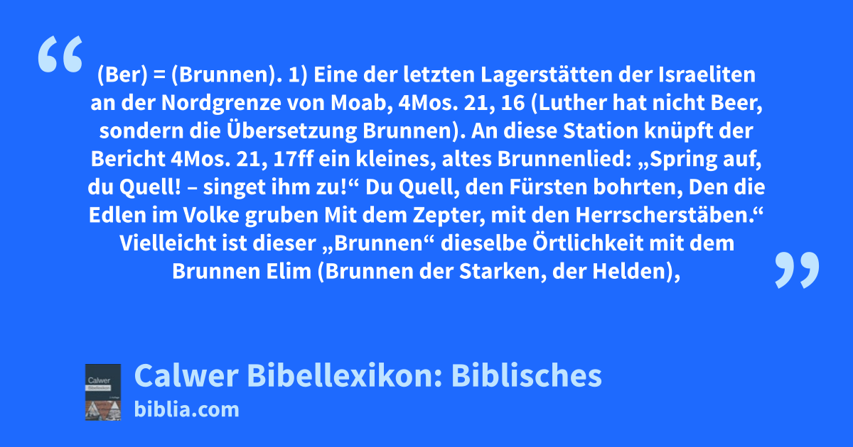 1) Eine der letzten Lagerstätten der Israeliten an der Nordgrenze von Moab, 4Mos. 21, 16 (Luther hat nicht Beer, sondern die Übersetzung Brunnen). An diese Station knüpft der Bericht 4Mos. 21, 17ff ein kleines, altes Brunnenlied: