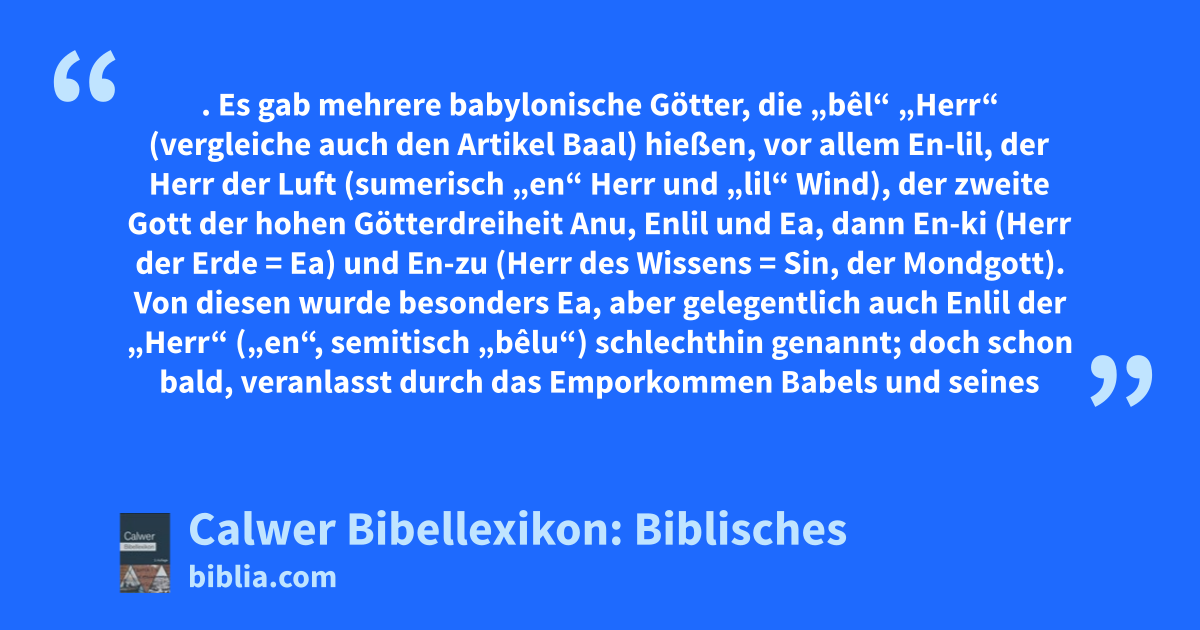 Bel. Es gab mehrere babylonische Götter, die „bêl“ „Herr“ (vergleiche auch den Artikel Baal) hießen, vor allem En-lil, der Herr der Luft (sumerisch „en“ Herr und „lil“ Wind), der zweite Gott der hohen Götterdreiheit Anu, Enlil und Ea, dann En-ki (Herr der Erde = Ea) und En-zu (Herr des Wissens = Sin, der Mondgott).