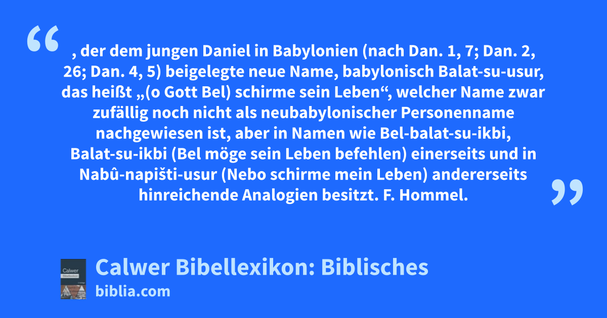 Beltsazar, der dem jungen Daniel in Babylonien (nach Dan. 1, 7; Dan. 2, 26; Dan. 4, 5) beigelegte neue Name, babylonisch Balat-su-usur, das heißt „(o Gott Bel) schirme sein Leben“, welcher Name zwar zufällig noch nicht als neubabylonischer Personenname nachgewiesen ist, aber in Namen wie Bel-balat-su-ikbi, Balat-su-ikbi (Bel möge sein Leben befehlen) einerseits und in Nabû-napišti-usur (Nebo schirme mein Leben) andererseits hinreichende Analogien besitzt.