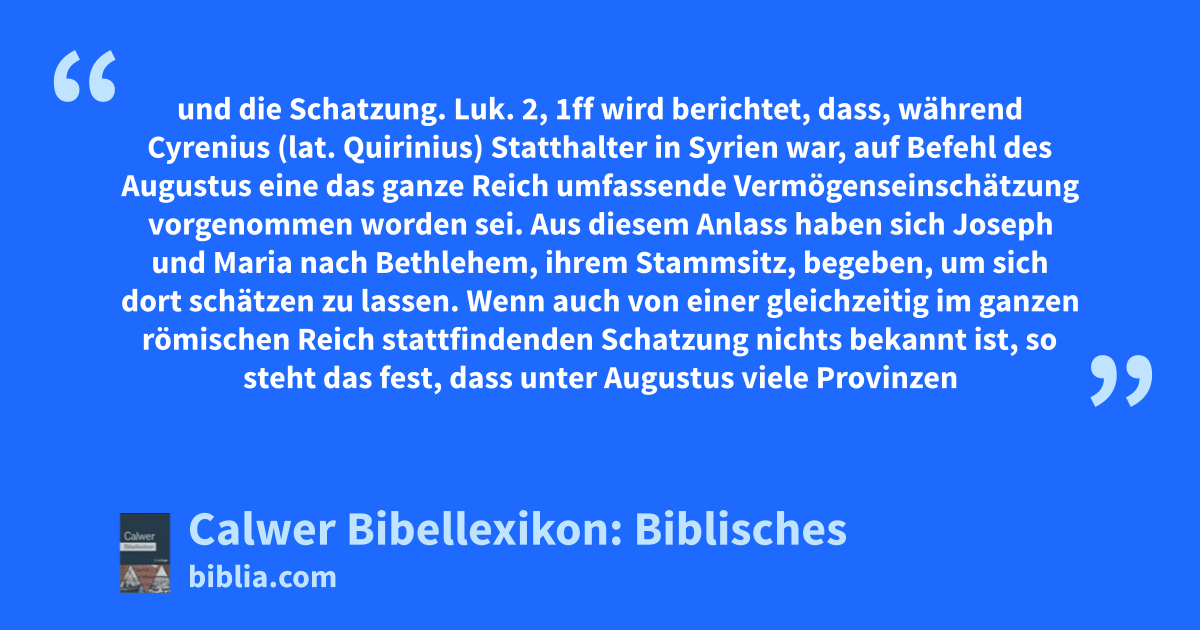 Cyrenius und die Schatzung. Luk. 2, 1ff wird berichtet, dass, während Cyrenius (lat. Quirinius) Statthalter in Syrien war, auf Befehl des Augustus eine das ganze Reich umfassende Vermögenseinschätzung vorgenommen worden sei. Aus diesem Anlass haben sich Joseph und Maria nach Bethlehem, ihrem Stammsitz, begeben, um sich dort schätzen zu lassen.