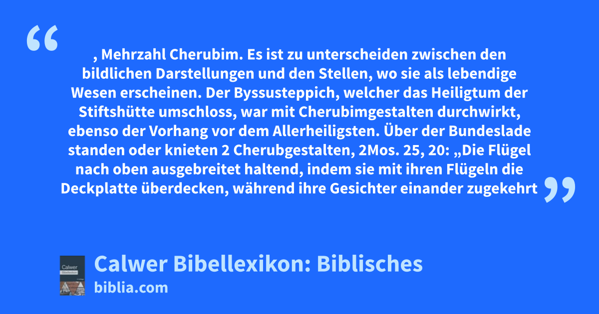 Cherub, Mehrzahl Cherubim. Es ist zu unterscheiden zwischen den bildlichen Darstellungen und den Stellen, wo sie als lebendige Wesen erscheinen. Der Byssusteppich, welcher das Heiligtum der Stiftshütte umschloss, war mit Cherubimgestalten durchwirkt, ebenso der Vorhang vor dem Allerheiligsten. Über der Bundeslade standen oder knieten 2 Cherubgestalten, 2Mos. 25, 20: „Die Flügel nach oben ausgebreitet haltend, indem sie mit ihren Flügeln die Deckplatte überdecken, während ihre Gesichter einander zugekehrt sind; gegen die Deckplatte hin sollen die Gesichter der Cherube gerichtet sein.“ Im Tempel waren die zum Heiligen und Allerheiligsten führenden Flügeltüren, ebenso das Getäfer der Wände mit ausgeschnitzten Ch.gestalten geschmückt. Der Vorhang zum Allerheiligsten war wieder mit Ch. durchwirkt. Im Allerheiligsten standen außer den zur Bundeslade gehörigen noch zwei 10 Ellen hohe Ch.gestalten (Abb. 80) aus Ölbaumholz, ihr Gesicht dem Heiligen zugekehrt und ihre ausgestreckten Flügel die Breite des Gemachs ausfüllend, 1Kön. 6, 23ff Auch die Wassergestelle im Vorhof waren mit Ch.figuren geziert.
