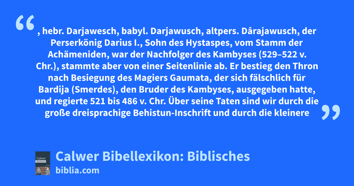 Darius, hebr. Darjawesch, babyl. Darjawusch, altpers. Dârajawusch, der Perserkönig Darius I., Sohn des Hystaspes, vom Stamm der Achämeniden, war der Nachfolger des Kambyses (529–522 v. Chr.), stammte aber von einer Seitenlinie ab. Er bestieg den Thron nach Besiegung des Magiers Gaumata, der sich fälschlich für Bardija (Smerdes), den Bruder des Kambyses, ausgegeben hatte, und regierte 521 bis 486 v. Chr.