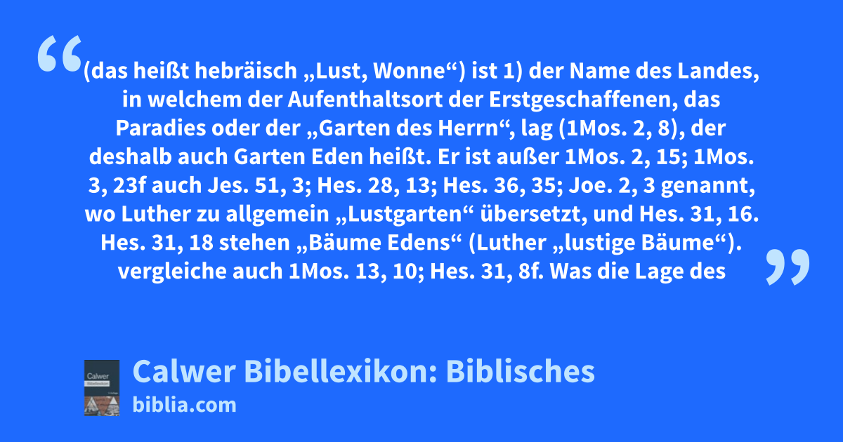 1) der Name des Landes, in welchem der Aufenthaltsort der Erstgeschaffenen, das Paradies oder der „Garten des Herrn“, lag (1Mos. 2, 8), der deshalb auch Garten Eden heißt.
