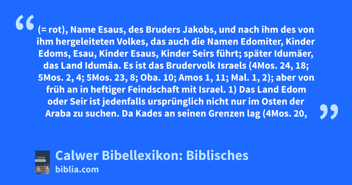 Edom (= rot), Name Esaus, des Bruders Jakobs, und nach ihm des von ihm hergeleiteten Volkes, das auch die Namen Edomiter, Kinder Edoms, Esau, Kinder Esaus, Kinder Seirs führt; später Idumäer, das Land Idumäa. Es ist das Brudervolk Israels (4Mos. 24, 18; 5Mos. 2, 4; 5Mos. 23, 8; Oba. 10; Amos 1, 11; Mal. 1, 2); aber von früh an in heftiger Feindschaft mit Israel.