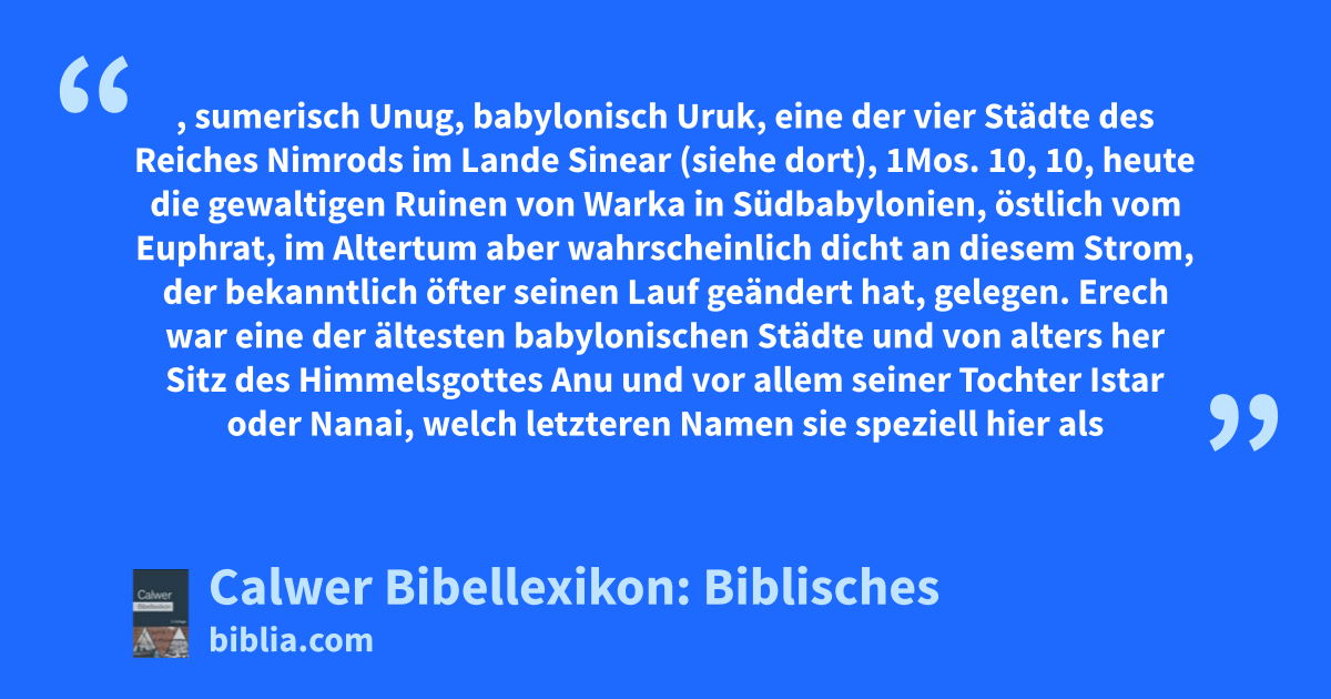 Erech, sumerisch Unug, babylonisch Uruk, eine der vier Städte des Reiches Nimrods im Lande Sinear (siehe dort), 1Mos. 10, 10, heute die gewaltigen Ruinen von Warka in Südbabylonien, östlich vom Euphrat, im Altertum aber wahrscheinlich dicht an diesem Strom, der bekanntlich öfter seinen Lauf geändert hat, gelegen.