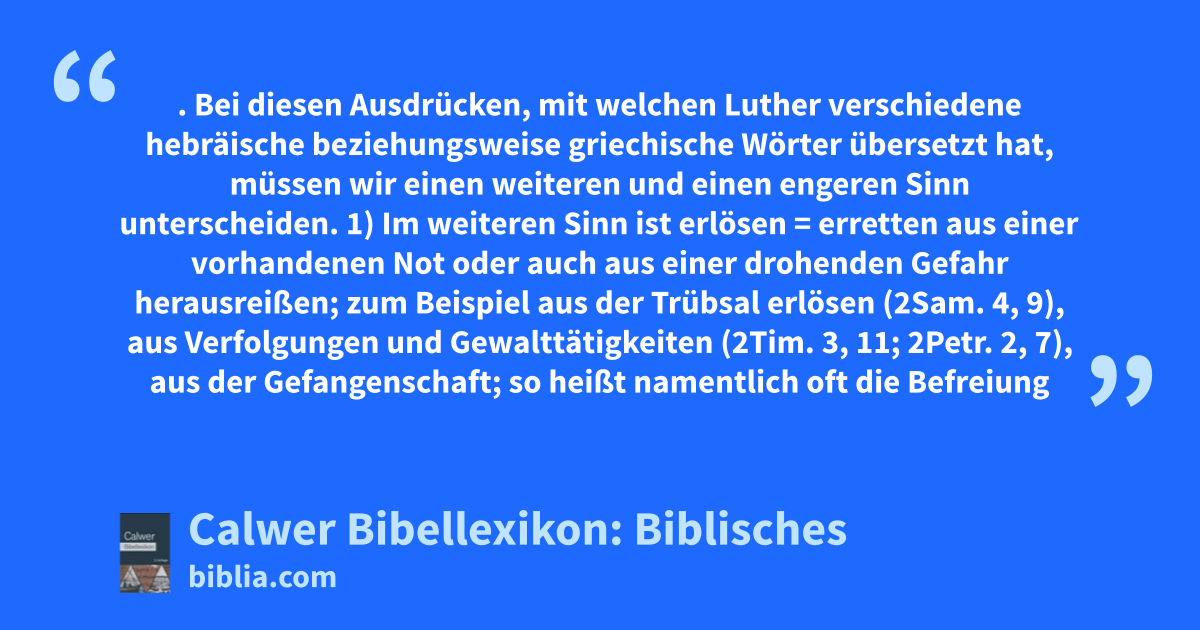 Erlösen, Erlösung, Erlöser. Bei diesen Ausdrücken, mit welchen Luther verschiedene hebräische beziehungsweise griechische Wörter übersetzt hat, müssen wir einen weiteren und einen engeren Sinn unterscheiden.