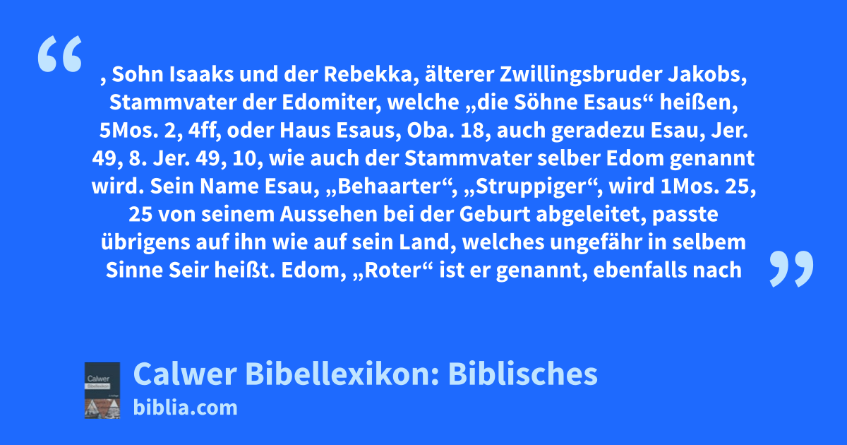 Esau, Sohn Isaaks und der Rebekka, älterer Zwillingsbruder Jakobs, Stammvater der Edomiter, welche „die Söhne Esaus“ heißen, 5Mos. 2, 4ff, oder Haus Esaus, Oba. 18, auch geradezu Esau, Jer. 49, 8. Jer. 49, 10, wie auch der Stammvater selber Edom genannt wird. Sein Name Esau, „Behaarter“, „Struppiger“, wird 1Mos. 25, 25 von seinem Aussehen bei der Geburt abgeleitet, passte übrigens auf ihn wie auf sein Land, welches ungefähr in selbem Sinne Seir heißt. Edom, „Roter“ ist er genannt, ebenfalls nach seinem Aussehen, 1Mos. 25, 25, oder zur Erinnerung an das rote Linsengericht, 1Mos. 25, 30, wie denn die Hebräer es lieben, mancherlei Beziehungen an einen Namen zu knüpfen. Gewöhnlich ist Esau Personenname, Edom (siehe diesen Artikel) Stammname.