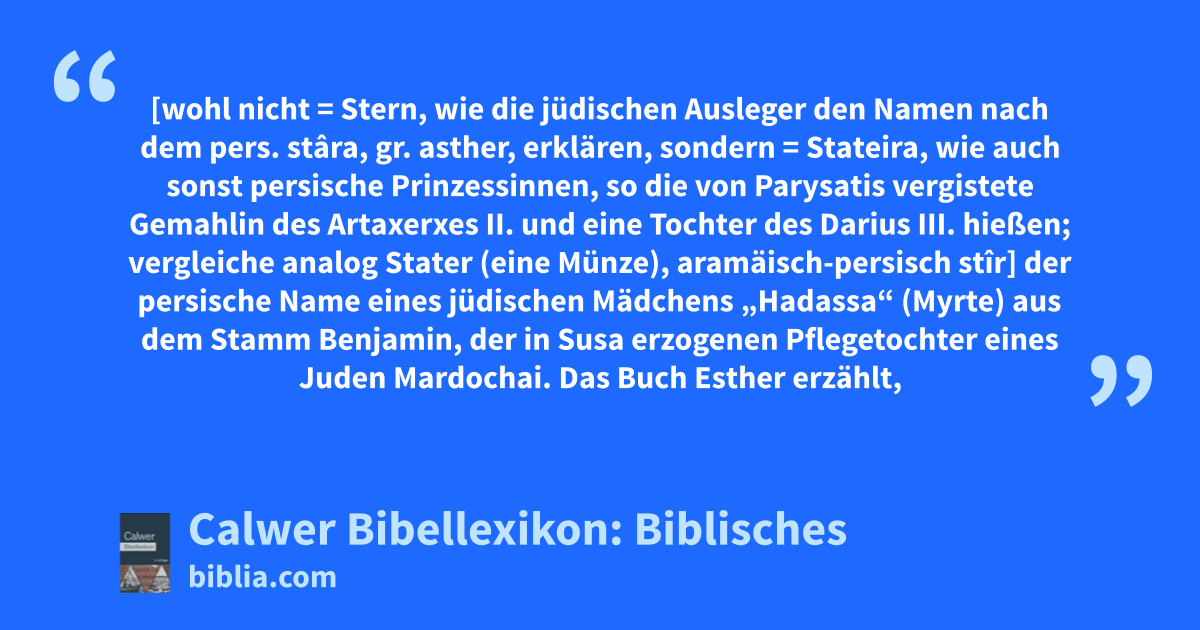 Esther [wohl nicht = Stern, wie die jüdischen Ausleger den Namen nach dem pers. stâra, gr. asther, erklären, sondern = Stateira, wie auch sonst persische Prinzessinnen, so die von Parysatis vergistete Gemahlin des Artaxerxes II. und eine Tochter des Darius III. hießen; vergleiche analog Stater (eine Münze), aramäisch-persisch stîr] der persische Name eines jüdischen Mädchens „Hadassa“ (Myrte) aus dem Stamm Benjamin, der in Susa erzogenen Pflegetochter eines Juden Mardochai.