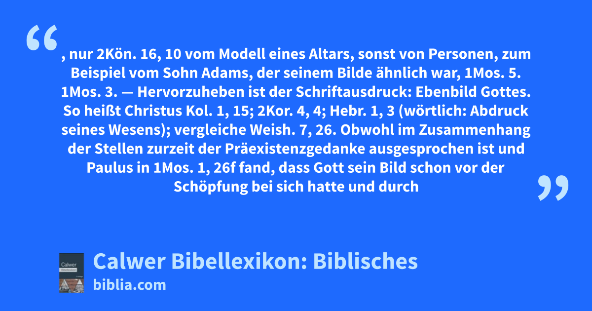 — Hervorzuheben ist der Schriftausdruck: Ebenbild Gottes. So heißt Christus Kol. 1, 15; 2Kor. 4, 4; Hebr. 1, 3 (wörtlich: Abdruck seines Wesens); vergleiche Weish. 7, 26. Obwohl im Zusammenhang der Stellen zurzeit der Präexistenzgedanke ausgesprochen ist und Paulus in 1Mos. 1, 26f fand, dass Gott sein Bild schon vor der Schöpfung bei sich hatte und durch dieses den Menschen schuf, benutzt er den Begriff nicht, um dadurch das ewige Verhältnis des Sohnes zum Vater zu verdeutlichen, sondern um der Gemeinde zu deuten, was sie an dem Fleischgewordenen hat: Die vollkommene Offenbarung der ganzen Fülle der unsichtbaren Gottheit, Kol. 2, 9, vergleiche Joh. 12, 45; Joh. 1, 14. Zugleich ist damit die Offenbarung und Verbürgung dessen gegeben, was der Mensch nach dem Heilsratschluss werden soll: Röm. 8, 29; 2Kor. 3, 18 (vergleiche auch 1Kor. 15, 48f und Artikel Bild).