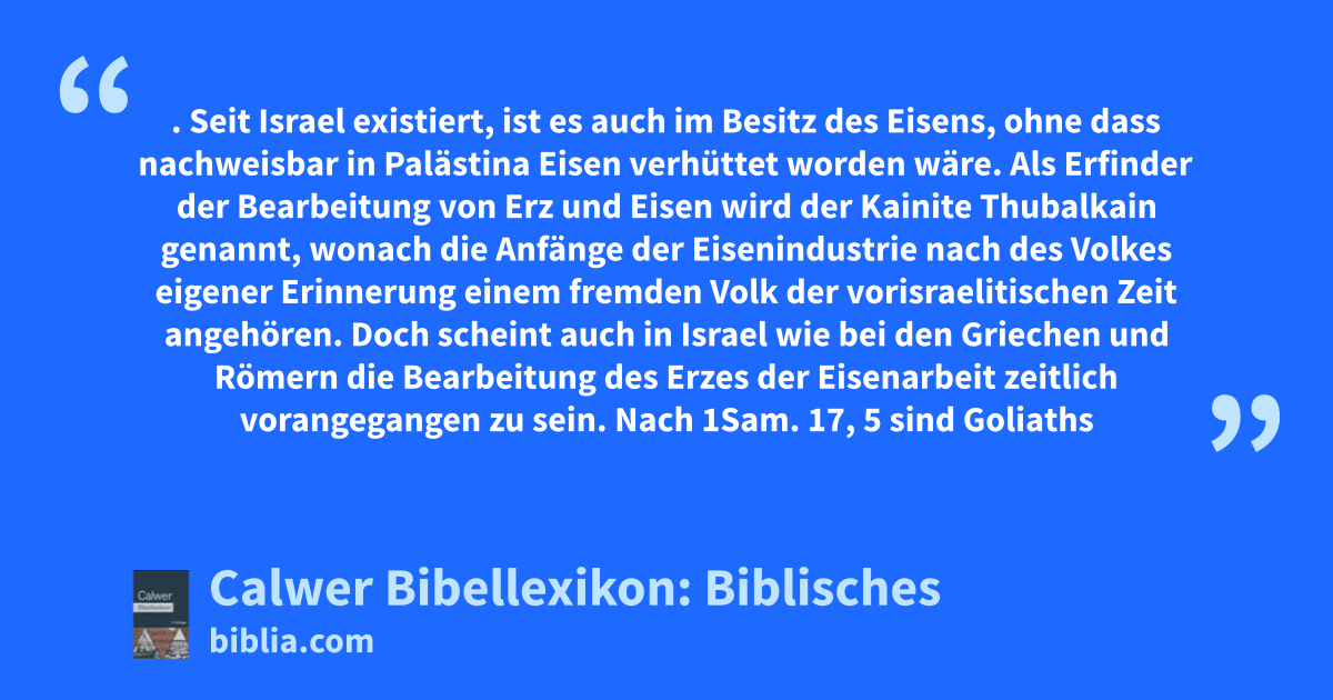 Doch scheint auch in Israel wie bei den Griechen und Römern die Bearbeitung des Erzes der Eisenarbeit zeitlich vorangegangen zu sein. Nach 1Sam. 17, 5 sind Goliaths Helm, Panzer, Schienen und Schild noch aus Erz. Richt. 16, 21 wird Simson mit ehernen Fesseln gefesselt, die Nägel, Haken und Geräte der Schmiedehütte sind aus Erz. Erst in späterer Zeit wurden auch zum Gebrauch im Tempel eiserne Geräte verwendet. Verarbeitetes Eisen, wie Degenklingen, wurde nach Hes. 27, 12. Hes. 27, 19 in Tyrus aus Spanien eingeführt. Ein wesentlicher Teil des Bedarfs scheint aber durch Produktion im Libanon gedeckt worden zu sein; die Menge der vortrefflichsten Eisenerze, wie Spateisen, Roteisen, Toneisen und Sphärosiderit, lädt wenigstens dort zur Verhüttung ein, wo ein Wald die Benutzung der trefflichsten Holzkohle gestattete. Fraas sah 1875 im Libanon die heute noch übliche Ausbringung des Eisens für Hufschmiede in der uralten Art der Holzvergeudung, wie sie wohl vor 3000 Jahren gebräuchlich war.
