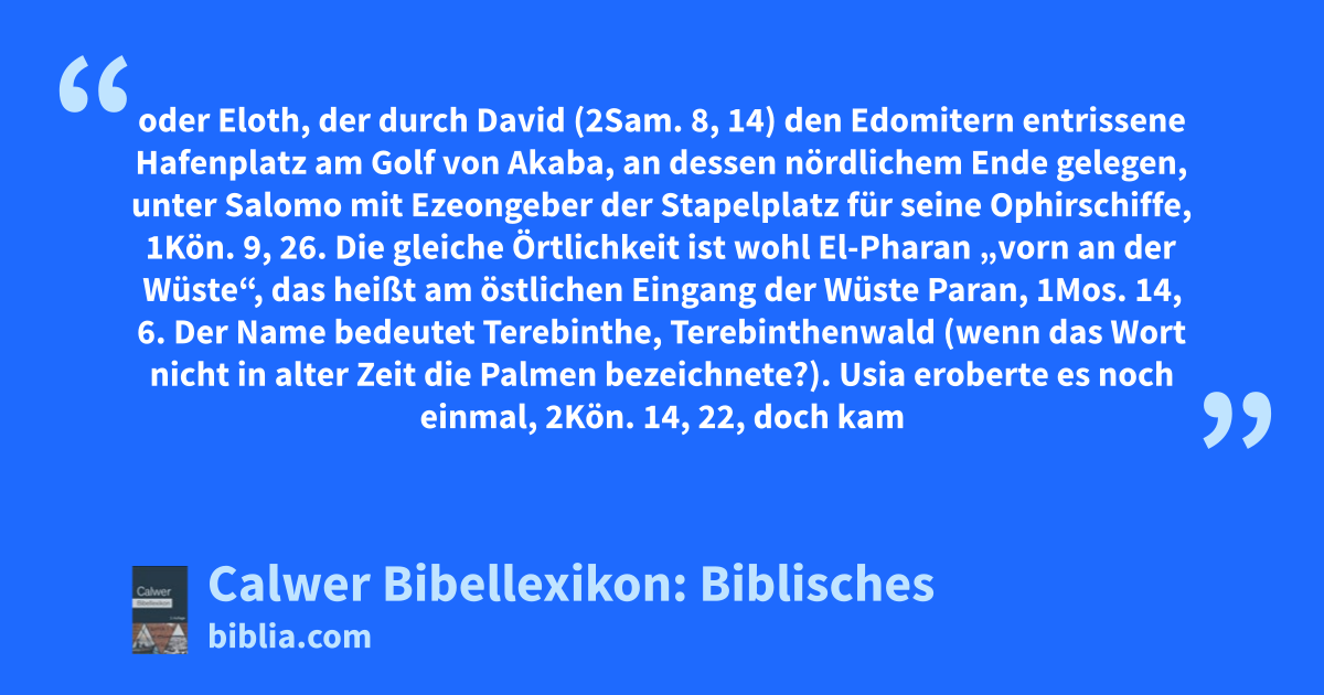 Elath oder Eloth, der durch David (2Sam. 8, 14) den Edomitern entrissene Hafenplatz am Golf von Akaba, an dessen nördlichem Ende gelegen, unter Salomo mit Ezeongeber der Stapelplatz für seine Ophirschiffe, 1Kön. 9, 26.
