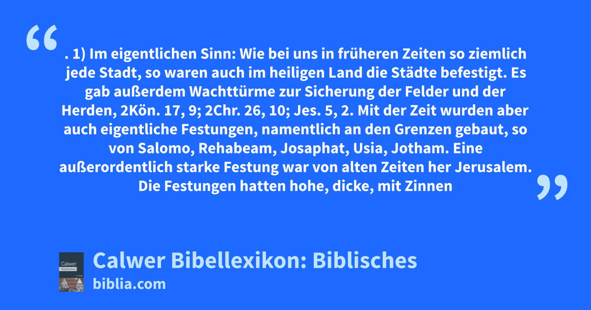 1) Im eigentlichen Sinn: Wie bei uns in früheren Zeiten so ziemlich jede Stadt, so waren auch im heiligen Land die Städte befestigt. Es gab außerdem Wachttürme zur Sicherung der Felder und der Herden, 2Kön. 17, 9; 2Chr. 26, 10; Jes. 5, 2.