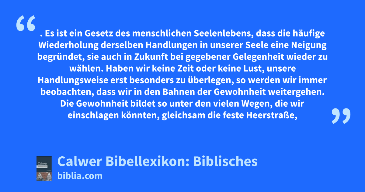 Im N. T. findet sich das Wort Gewohnheit im Sinn einer bestehenden Sitte und Ordnung, Matth. 27, 15; Luk. 1, 9; Luk. 2, 42; Luk. 4, 16; Luk. 22, 39. Ist gleich nicht ein bloß gewohnheitsmäßiges, sondern ein bewusstes, freies Tun des Guten das Ziel der christlichen Sittlichkeit, so kann doch ein durch Gottes Gnade fest gewordenes Herz, Hebr. 13, 9, auch nicht ohne feste Gewohnheiten des Lebens und Handelns gedacht werden. Auch wäre ein Wachstum im Guten gar nicht möglich, wenn nicht die erreichte Stufe durch die Gewohnheit zu bleibendem Besitz würde.