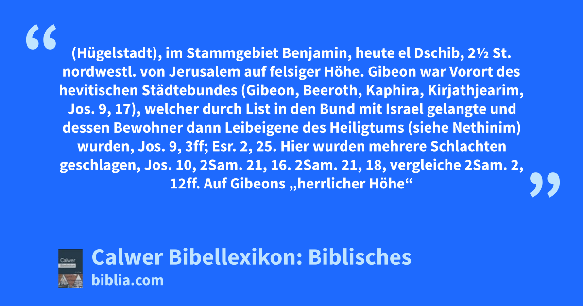 Gibeon war Vorort des hevitischen Städtebundes (Gibeon, Beeroth, Kaphira, Kirjathjearim, Jos. 9, 17), welcher durch List in den Bund mit Israel gelangte und dessen Bewohner dann Leibeigene des Heiligtums (siehe Nethinim) wurden, Jos. 9, 3ff; Esr. 2, 25. Hier wurden mehrere Schlachten geschlagen, Jos. 10, 2Sam. 21, 16. 2Sam. 21, 18, vergleiche 2Sam. 2, 12ff. Auf Gibeons „herrlicher Höhe“ stand lange die Stiftshütte und opferte Salomo, 1Kön. 3, 4ff; 2Chr. 1, 3ff An den Teich zu Gibeon, 2Sam. 2, 13; Jer. 41, 12, erinnert noch eine kräftige Quelle, die aus einem gewaltigen Felsen fließt und in einem großen Teich gesammelt ist.