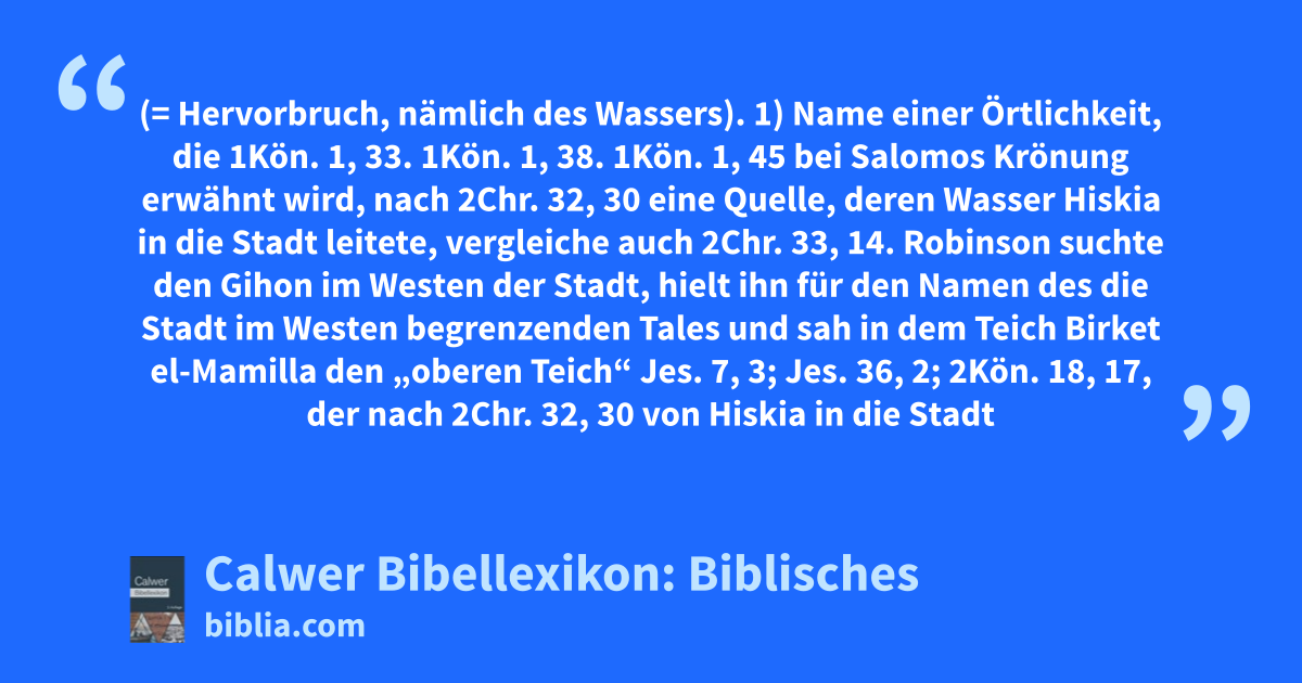 1) Name einer Örtlichkeit, die 1Kön. 1, 33. 1Kön. 1, 38. 1Kön. 1, 45 bei Salomos Krönung erwähnt wird, nach 2Chr. 32, 30 eine Quelle, deren Wasser Hiskia in die Stadt leitete, vergleiche auch 2Chr. 33, 14.