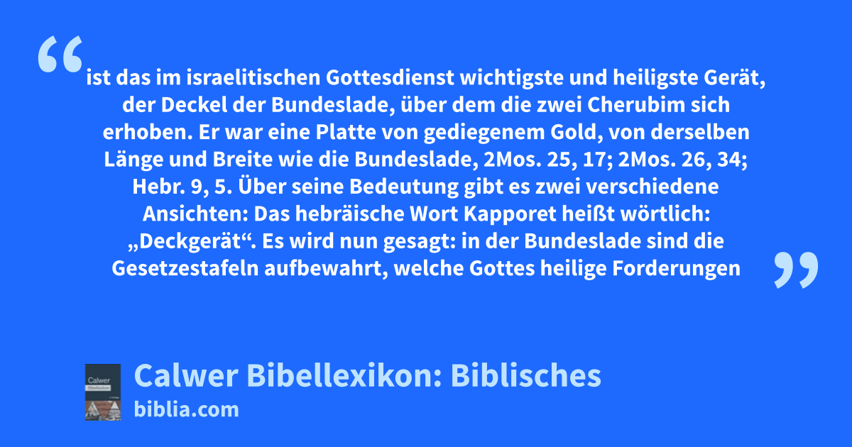 — Die andere, wohl richtigere Erklärung fasst (im Anschluss an die Übersetzung der Septuaginta hilasterion) dieses „Deckgerät“ als Sühngerät. Das Wort „Decken“ drückt nämlich nicht sowohl das Decken im Sinne von: „mit einem Deckel verschließen“ aus, sondern das Decken durch Überstreichen (vergleiche 1Mos. 6, 14 Grundtext) und hat den Sinn von „deckend tilgen“, das heißt sühnen (vergleiche 3Mos. 17, 11 Grundtext). Das Gerät heißt nun: Sühngerät, weil der Hohepriester das sühnende Blut des Opfers an dasselbe brachte. Die Cherubim, die auf dem Gnadenstuhl sich erheben, sind das Symbol der Gnadennähe Gottes. Vor diese Gegenwart Gottes wird in der Opferhandlung des Hohepriesters das Blut zur Sühne, zur Erlangung der Vergebung gebracht, 3Mos. 16, 14, und so ist die Bezeichnung Gnadenstuhl oder Gnadenthron eine ganz passende für die Bedeutung dieses heiligen Gerätes.