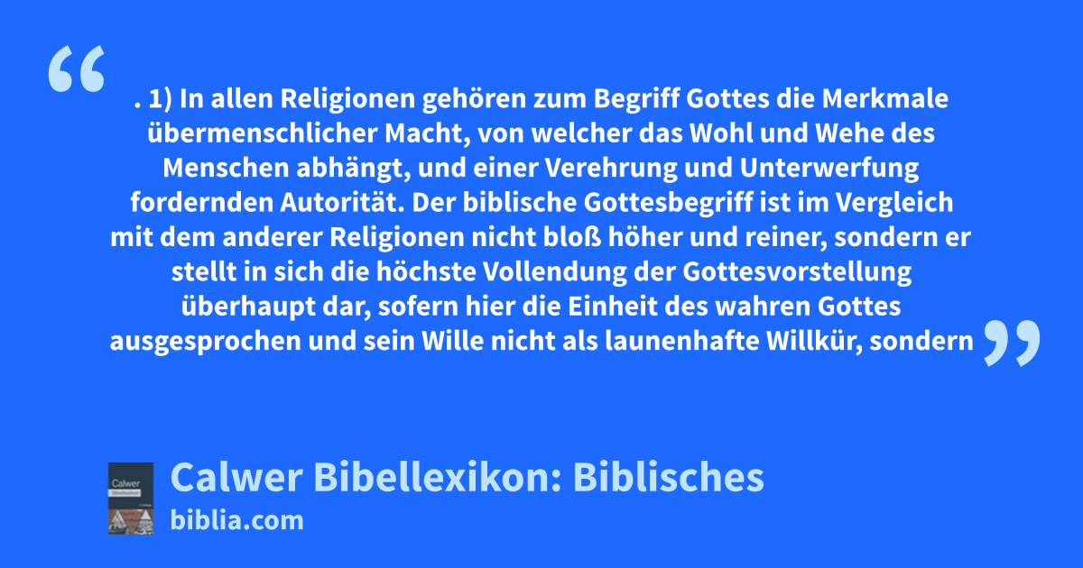 1) In allen Religionen gehören zum Begriff Gottes die Merkmale übermenschlicher Macht, von welcher das Wohl und Wehe des Menschen abhängt, und einer Verehrung und Unterwerfung fordernden Autorität. Der biblische Gottesbegriff ist im Vergleich mit dem anderer Religionen nicht bloß höher und reiner, sondern er stellt in sich die höchste Vollendung der Gottesvorstellung überhaupt dar, sofern hier die Einheit des wahren Gottes ausgesprochen und sein Wille nicht als launenhafte Willkür, sondern als in Heiligkeit und Liebe sich erweisender sittlicher Wille erkannt wird. Die alttestamentlichen Gottesnamen bezeichnen Gott teils als den Starken (El), teils als Gegenstand der Ehrfurcht (Elohim), teils als den unwandelbar seienden, treuen Bundesgott (Jehovah, richtiger Jahveh). Das griechische Wort des Neuen Testaments θεός ist von streitiger Ableitung; nach den einen würde es Gott als den Angeflehten, nach anderen als den Weltschöpfer und -Ordner, wieder nach anderen, mit dem lateinischen „deus“ verwandt, als den „Leuchtenden“ bezeichnen. Ebenso steht es mit unserem deutschen Wort „Gott“, welchem die sinnvolle Ableitung von „gut“ von den Sprachforschern bestritten wird, ohne dass eine andere der vorgeschlagenen Ableitungen sich allgemeiner Billigung rühmen könnte.