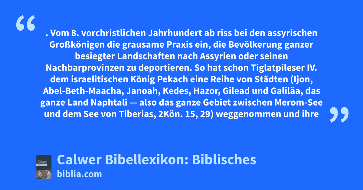 So hat schon Tiglatpileser IV. dem israelitischen König Pekach eine Reihe von Städten (Ijon, Abel-Beth-Maacha, Janoah, Kedes, Hazor, Gilead und Galiläa, das ganze Land Naphtali — also das ganze Gebiet zwischen Merom-See und dem See von Tiberias, 2Kön. 15, 29) weggenommen und ihre Bewohner nach Assyrien geführt, bis dann Sargon nach der Eroberung Samarias, wie seine Annalen berichten, 27 290 Einwohner wegführte und sie (2Kön. 17, 6; 2Kön. 18, 11) in Mesopotamien und Medien ansiedelte.