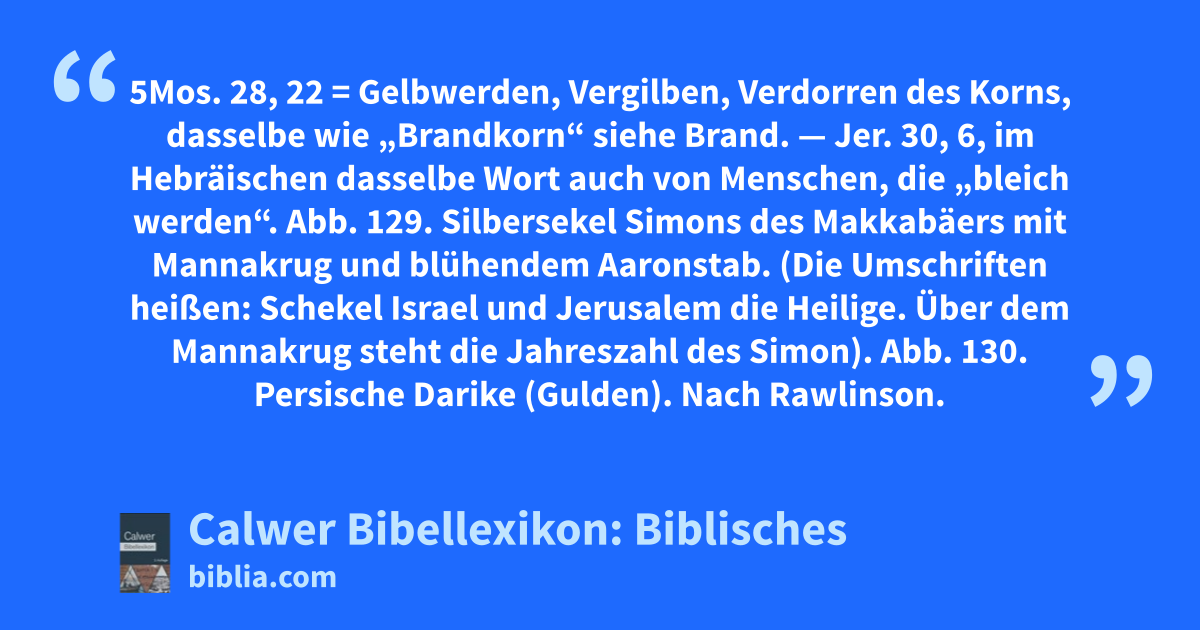 Gelbsucht 5Mos. 28, 22 = Gelbwerden, Vergilben, Verdorren des Korns, dasselbe wie „Brandkorn“ siehe Brand. — Jer. 30, 6, im Hebräischen dasselbe Wort auch von Menschen, die „bleich werden“.