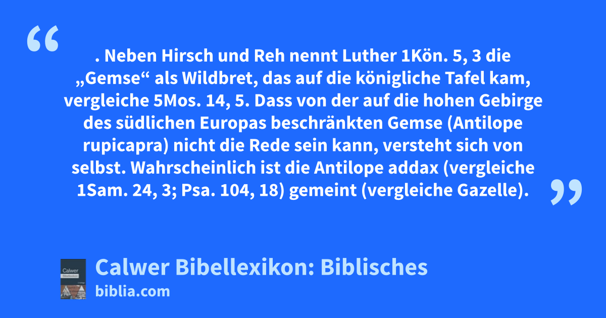 Gemse. Neben Hirsch und Reh nennt Luther 1Kön. 5, 3 die „Gemse“ als Wildbret, das auf die königliche Tafel kam, vergleiche 5Mos. 14, 5.