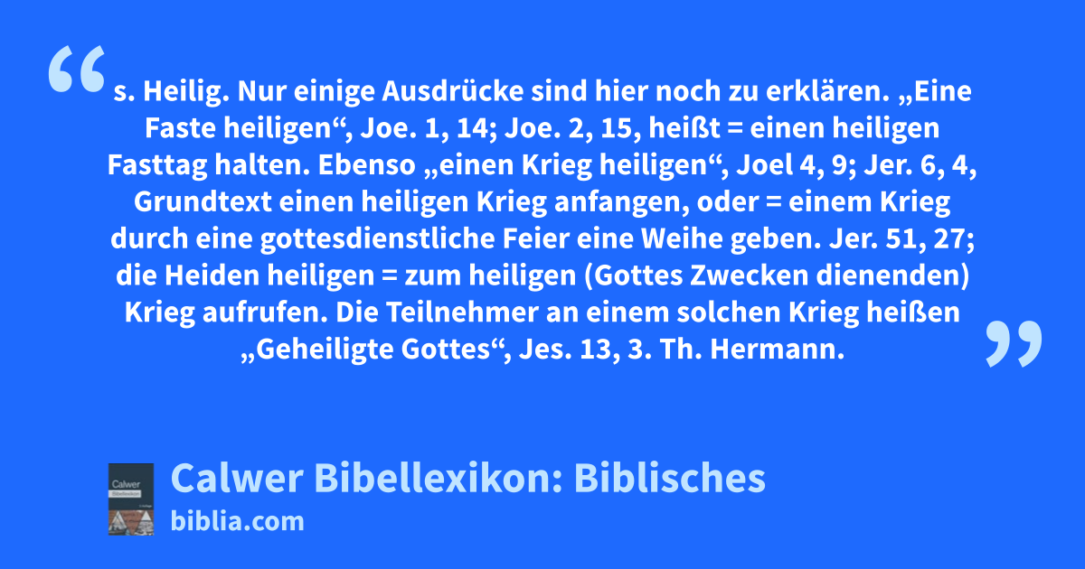 Heiligen s. Heilig. Nur einige Ausdrücke sind hier noch zu erklären. „Eine Faste heiligen“, Joe. 1, 14; Joe. 2, 15, heißt = einen heiligen Fasttag halten. Ebenso „einen Krieg heiligen“, Joel 4, 9; Jer. 6, 4, Grundtext einen heiligen Krieg anfangen, oder = einem Krieg durch eine gottesdienstliche Feier eine Weihe geben. Jer. 51, 27; die Heiden heiligen = zum heiligen (Gottes Zwecken dienenden) Krieg aufrufen. Die Teilnehmer an einem solchen Krieg heißen „Geheiligte Gottes“, Jes. 13, 3.