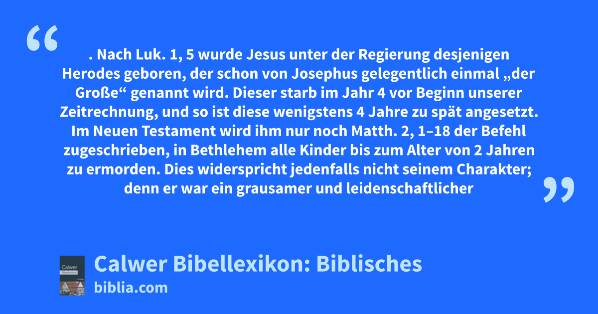 Herodes. Nach Luk. 1, 5 wurde Jesus unter der Regierung desjenigen Herodes geboren, der schon von Josephus gelegentlich einmal „der Große“ genannt wird. Dieser starb im Jahr 4 vor Beginn unserer Zeitrechnung, und so ist diese wenigstens 4 Jahre zu spät angesetzt. Im Neuen Testament wird ihm nur noch Matth. 2, 1–18 der Befehl zugeschrieben, in Bethlehem alle Kinder bis zum Alter von 2 Jahren zu ermorden. Dies widerspricht jedenfalls nicht seinem Charakter; denn er war ein grausamer und leidenschaftlicher Mensch, scheute vor nichts zurück, um seinen Willen durchzusetzen, wenn es auch Ströme Bluts kostete; schonte er ja doch selbst seine nächsten Verwandten nicht.