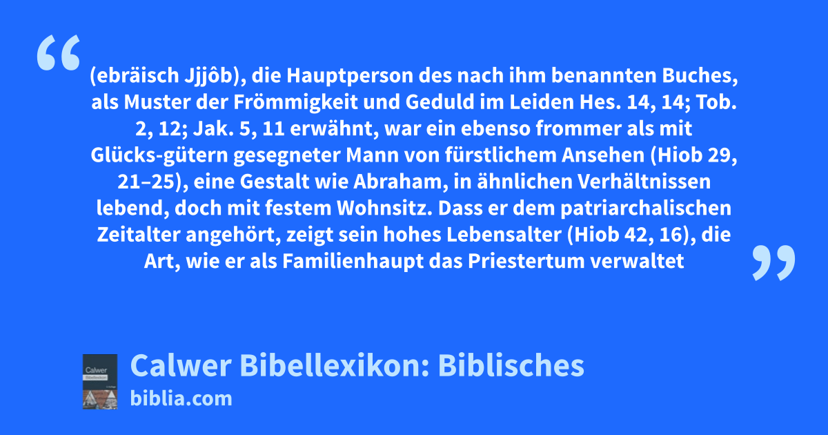 Hiob (ebräisch Jjjôb), die Hauptperson des nach ihm benannten Buches, als Muster der Frömmigkeit und Geduld im Leiden Hes. 14, 14; Tob. 2, 12; Jak. 5, 11 erwähnt, war ein ebenso frommer als mit Glücks-gütern gesegneter Mann von fürstlichem Ansehen (Hiob 29, 21–25), eine Gestalt wie Abraham, in ähnlichen Verhältnissen lebend, doch mit festem Wohnsitz. Dass er dem patriarchalischen Zeitalter angehört, zeigt sein hohes Lebensalter (Hiob 42, 16), die Art, wie er als Familienhaupt das Priestertum verwaltet (Hiob 1, 5), auch das Fehlen des Namens Jahveh in seinem und seiner Freunde Mund. Seine Heimat Uz (Hiob 1, 1) lag jedenfalls östlich von Palästina im nördlichen, dem sogenannten wüsten Arabien; denn Hiob gehört zu denen, die gegen Morgen wohnen (Hiob 1, 3).