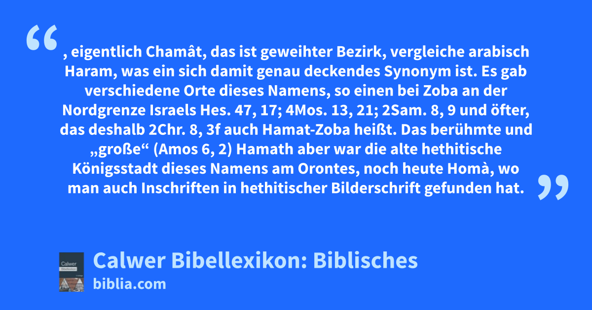 Hamath, eigentlich Chamât, das ist geweihter Bezirk, vergleiche arabisch Haram, was ein sich damit genau deckendes Synonym ist. Es gab verschiedene Orte dieses Namens, so einen bei Zoba an der Nordgrenze Israels Hes. 47, 17; 4Mos. 13, 21; 2Sam. 8, 9 und öfter, das deshalb 2Chr. 8, 3f auch Hamat-Zoba heißt.