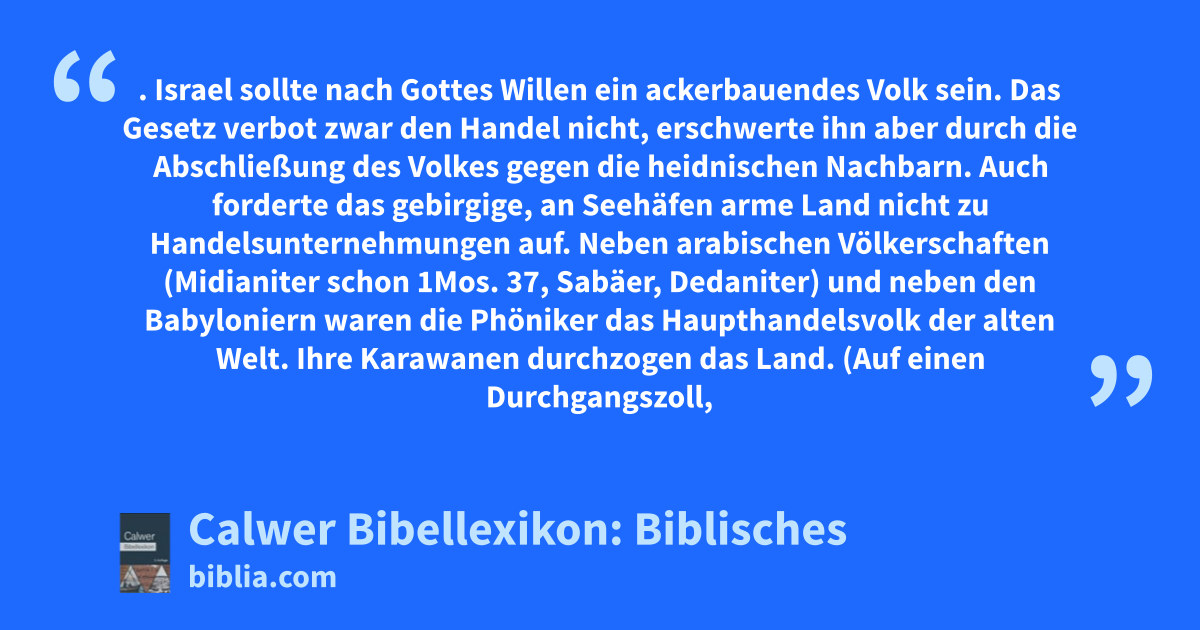 Handel. Israel sollte nach Gottes Willen ein ackerbauendes Volk sein. Das Gesetz verbot zwar den Handel nicht, erschwerte ihn aber durch die Abschließung des Volkes gegen die heidnischen Nachbarn. Auch forderte das gebirgige, an Seehäfen arme Land nicht zu Handelsunternehmungen auf.