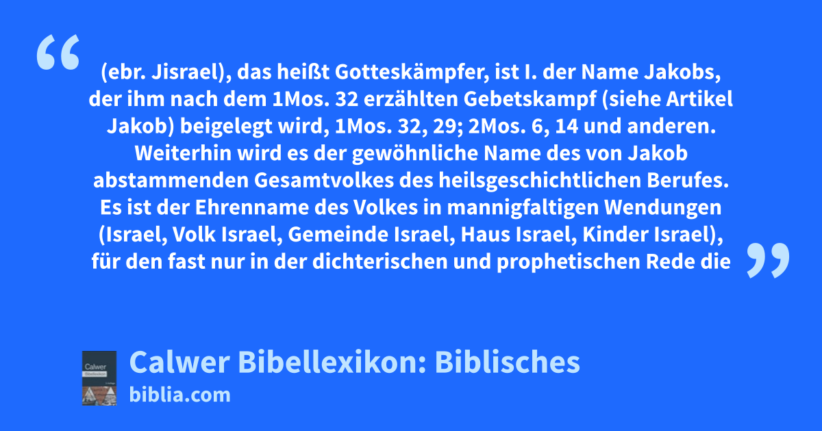 Israel (ebr. Jisrael), das heißt Gotteskämpfer, ist I. der Name Jakobs, der ihm nach dem 1Mos. 32 erzählten Gebetskampf (siehe Artikel Jakob) beigelegt wird, 1Mos. 32, 29; 2Mos. 6, 14 und anderen. Weiterhin wird es der gewöhnliche Name des von Jakob abstammenden Gesamtvolkes des heilsgeschichtlichen Berufes. Es ist der Ehrenname des Volkes in mannigfaltigen Wendungen (Israel, Volk Israel, Gemeinde Israel, Haus Israel, Kinder Israel), für den fast nur in der dichterischen und prophetischen Rede die Namen „Jakob“, „Haus Jakobs“ usw. eintreten. (Vergleiche auch Jesurun.)