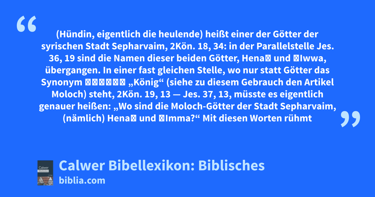 In einer fast gleichen Stelle, wo nur statt Götter das Synonym מֶלֶךְ „König“ (siehe zu diesem Gebrauch den Artikel Moloch) steht, 2Kön. 19, 13 — Jes. 37, 13, müsste es eigentlich genauer heißen: „Wo sind die Moloch-Götter der Stadt Sepharvaim, (nämlich) Hena‛ und ‛Imma?“ Mit diesen Worten rühmt sich dem Hiskia gegenüber der assyrische Gesandte.