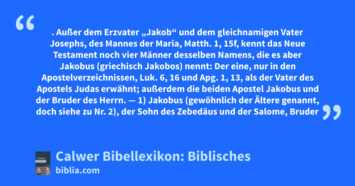 — 1) Jakobus (gewöhnlich der Ältere genannt, doch siehe zu Nr. 2), der Sohn des Zebedäus und der Salome, Bruder des Apostels Johannes, wohl älter als dieser (da er in den Apostelverzeichnissen stets vor demselben genannt wird).