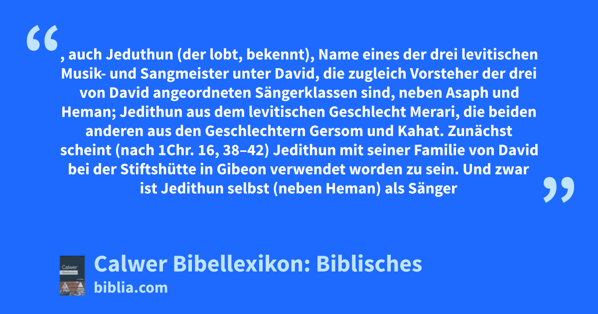 Jedithun, auch Jeduthun (der lobt, bekennt), Name eines der drei levitischen Musik- und Sangmeister unter David, die zugleich Vorsteher der drei von David angeordneten Sängerklassen sind, neben Asaph und Heman; Jedithun aus dem levitischen Geschlecht Merari, die beiden anderen aus den Geschlechtern Gersom und Kahat. Zunächst scheint (nach 1Chr. 16, 38–42) Jedithun mit seiner Familie von David bei der Stiftshütte in Gibeon verwendet worden zu sein. Und zwar ist Jedithun selbst (neben Heman) als Sänger Davids, seine Söhne als Torwärter des Heiligtums in Gibeon bezeichnet. Nur der eine Sohn Jedithuns Obed-Edom (siehe diesen Artikel) erscheint schon jetzt in Jerusalem selbst als Torwärter.