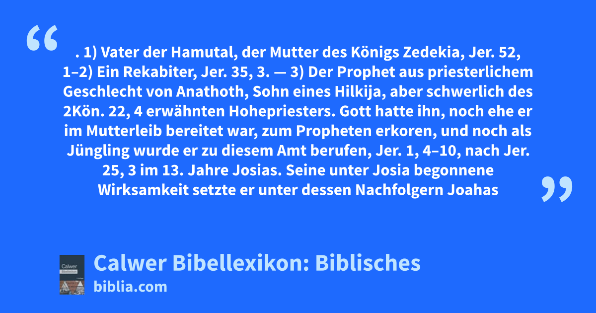 — 3) Der Prophet aus priesterlichem Geschlecht von Anathoth, Sohn eines Hilkija, aber schwerlich des 2Kön. 22, 4 erwähnten Hohepriesters. Gott hatte ihn, noch ehe er im Mutterleib bereitet war, zum Propheten erkoren, und noch als Jüngling wurde er zu diesem Amt berufen, Jer. 1, 4–10, nach Jer. 25, 3 im 13. Jahre Josias.