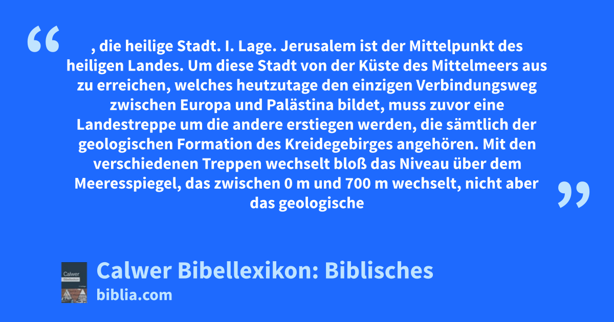 — Bei seiner hohen Lage hat Jerusalem ein gesundes Klima; die mittlere Temperatur bewegt sich von Mai bis Oktober zwischen 20 und 24,1 °C, in den Wintermonaten Dezember, Januar, Februar sind es 11°, 8,5°, 9,2°. Die Luft ist im Sommer, wenn nicht der Südwind unerträgliche Hitze bringt, rein und klar, im Winter gibt es zuweilen Frost, auch wohl rasch wieder schwindenden Schnee. — Den schönsten Anblick gewährt immer noch wie vor Zeiten (Matth. 24, 1) der Anblick der Stadt vom Ölberg aus. Die 12–15 m hohe Stadtmauer umgibt mit ihren 34 Türmen das Ganze, die Kuppeldächer der gewöhnlichen Häuser ragen kaum über die Mauer hinaus, nur die Spitzen zahlreicher Minarette, die Türme der Kirchen, Klöster und Moscheen werden sichtbar, voran die zwei Moscheen des Tempelplatzes, die heilige Grabeskirche und die Zitadelle (vergleiche Tafel 1 und 14). — II. Das heutige Jerusalem.